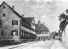 Der Blick geht hier - von der Johanneskirche her betrachtet - durch die Bottwarstraße in Richtung der Kreuzung mit der Unterländer- und Ludwigsburger Straße. Links sieht man das Gebäude des Gasthauses »Zum Adler«, dahinter ragt das alte Rathaus in die Bildmitte. Eine weitere Aufnahme aus ganz ähnlicher Perspektive zeigt den Straßenabschnitt gut 40 Jahre später...