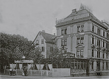 Vermutlich1 steht der Fotograf im Kreuzungsbereich der Bahnhofstraße2 und blickt rechts die Frösnerstraße3 hinunter auf das Haus mit der Hausnummer 6. Das Gebäude existiert nicht mehr, sondern wurde nach dem Krieg durch einen Neubau ersetzt. Außerdem wurde wohl um 1909 das Haus Bahnhofstr. 21 daneben bzw. davor gesetzt.