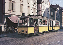 An einem warmen Sommertag durchquert ein Zug der Linie 24 auf dem Weg vom Schlachthof nach Mühlhausen die Daimler Straße Richtung Bahnhof Cannstatt (Wilhelmsplatz,, Rostensteinbrücke, Münster, Aubrücke, Hofen, Mühlhausen). Die Aufnahme entstand kurz vor der Einsenbahnunterführung Ecke Daimler- Decker- und Bahnhofstraße.