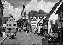 Blick in die Pfarrhausstraße1 hin zur Evangelischen Kirche. Links die östliche Rathausfassade. Das kleine Gasthaus »zur Ratstube« schließt sich an. Rechts vorne der ehemalige »Consumverein«, heute befindet sich dort die Metzgerei Bienzle. Dem Gebäude schließt sich das kleine Waschhaus mit der »Bäckerei Mezger (Kirchbeck)« an, dahinter die Flaschnerei Renz. Zwischen der Flaschnerei und dem folgendem Gebäude mit dem Erker zweigt die Schulstraße2 ab.