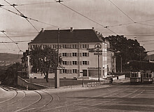 Über die Gebäude im Vordergrund1 weiß der Architekt Simon Otto Volk zu berichten: »Die Gebäude im Vordergrund waren Betriebswohnungen der »Stuttgarter Straßenbahnen« und wurden - laut Adressbuch - von »Straßenbahnschaffnern«, »Straßenbahnwagenführer« u. a. bewohnt. Nach Schilderungen ehemaliger Bewohner haben viele der dort aufgewachsenen Kinder nach dem Krieg in den nahen Gärten der Villa Moser einen idealen Spielplatz gefunden«