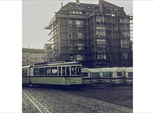 Der Betrachter befindet sich in der historischen Aufnahme an der Straßenbahnschleife in der Ostendstraße, wobei das Heck des Triebwagen dabei fast bis an die Ostendstraße reichen dürfte. Aus der heutigen Sicht steht er parallel der Schönbühlstraße, blickt frontal auf den an der Ostendstraße stehenden Häuserblock sowie seitlich links auf das Gebäude längs der Schönbühlstraße.
