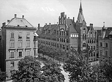 An der Ecke Schwab- Bebelstraße1 blickt der Fotograf auf das imposante Gebäude der Schwabschule mit ihren kunstvollen Fenstern, dem ebenso imposanten Turmhelm und den Fassadenverzierungen. Bei der Schlüsselübergabe an den damaligen Oberbürgermeister Heinrich Gauß am 05. Mai 1902 betonte der Architekt, »...dass bei heutigen Schulbauten nicht nur auf Zweckmäßigkeit, sondern auch auf Schönheit im Inneren und Äußern Bedacht genommen werden müsse, um bei den Kindern schon frühzeitig den Sinn für die Kunst zu wecken« 2