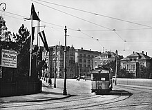 Der historische Standort des Betrachters ist nur noch schwer einzunehmen. Er steht über dem Schwanentunnel - auf dem Grün zwischen den Mineralbad-Sprudlern und über der Tunnelpforte zur Einfahrt in den Tunnel.